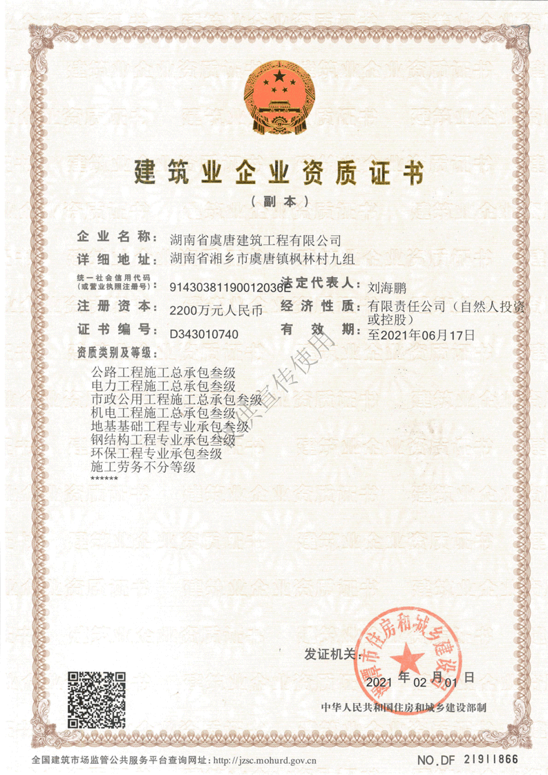 鋼結構專業承包叁級、環保工程專業工程承包叁級、承裝(修、試)電力設施四級、路面養護乙級資質、橋梁養護乙級資質、隧道養護乙級資質、交通安全設施養護乙級資質、施工勞務不分等級等多項施工資質。